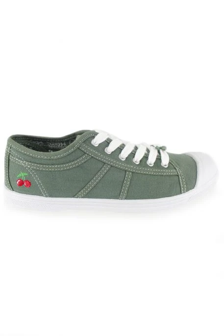 Baskets Le Temps Des Cerises Basic pour femme. Baskets en toile avec broderie cerise au niveau du talon. Surpiqûres blanches et lacets blancs. Semelle blanche.