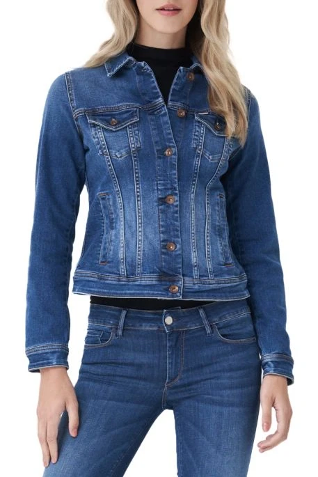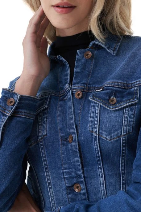 Veste en jean Salsa pour femme. Veste de coupe slim, manches longues, col classique. Poignets boutonés, poches poitrine à rabat boutonné. Ce modèle possède deux poches latérales passepoilées.