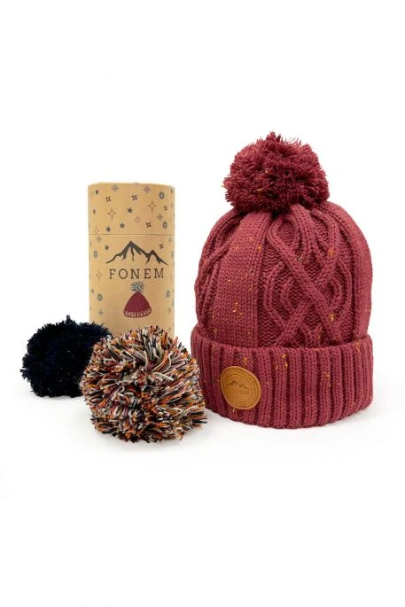 Bonnet de la marque Fonem. Bonnet de couleur bordeaux. Trois pompons de couleurs différentes interchangeables grâce à un aimant.