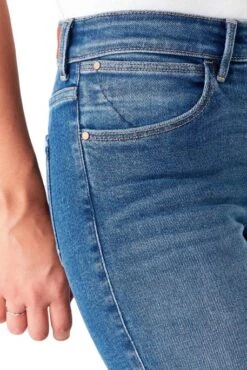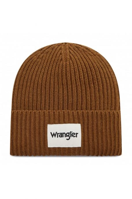 Bonnet Wrangler à côtes contrastées bleu. Modèle retroussé et décontracté. Logo Wrangler sur fond blanc sur le devant du bonnet.