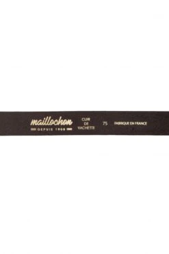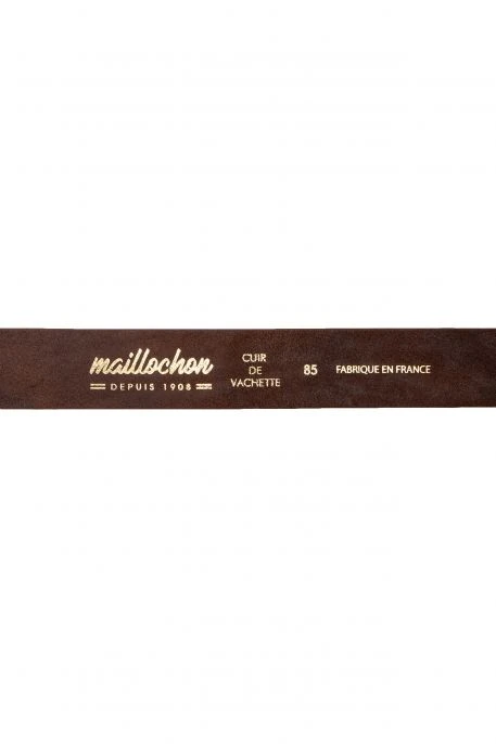 Ceinture Maillochon Langeac pour homme. Ceinture en cuir de vachette, boucle en acier et logo « M » de Maillochon embossé et tranche arrondie de couleur marron.
