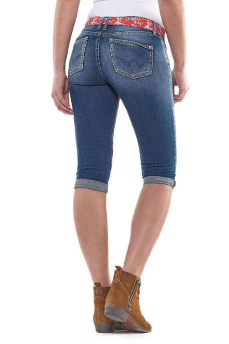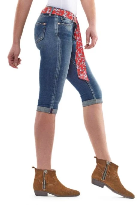 Corsaire Le Temps des Cerises Mandy. Crosaire en jean, coupe ajustée, fermeture par bouton et braguette zippée. Modèle 5 poches dont une retournée. Ceinture amovible à motif fleurs et revers cousus.