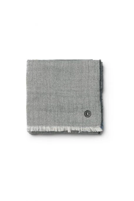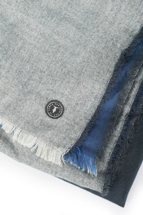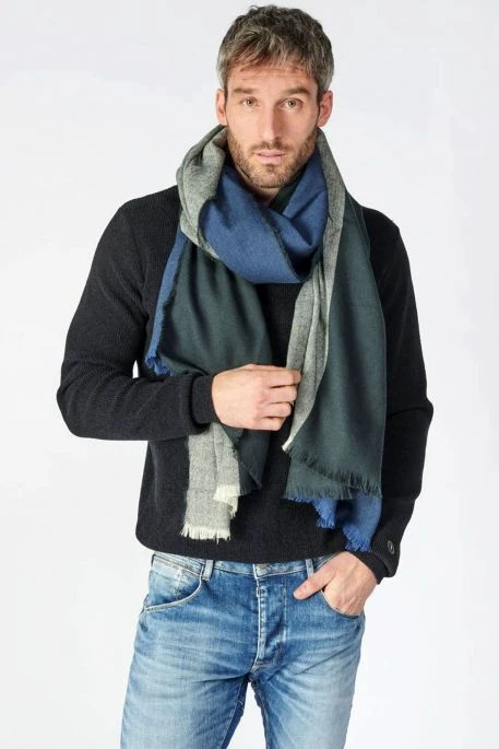 Echarpe Le Temps Des Cerises pour homme. Grande écharpe avec trois couleurs, noir, bleu marine et écru. Les bords sont éffilochés.