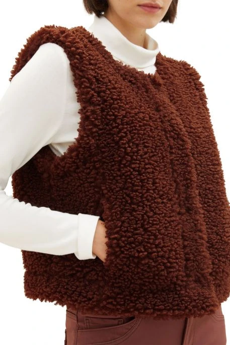 Gilet sans manches femme de la marque Tom tailor. Imitation mouton, légèrement court. Gilet tendance cet hiver à porter avec un pull fin col roulé, une chemise ou une robe.