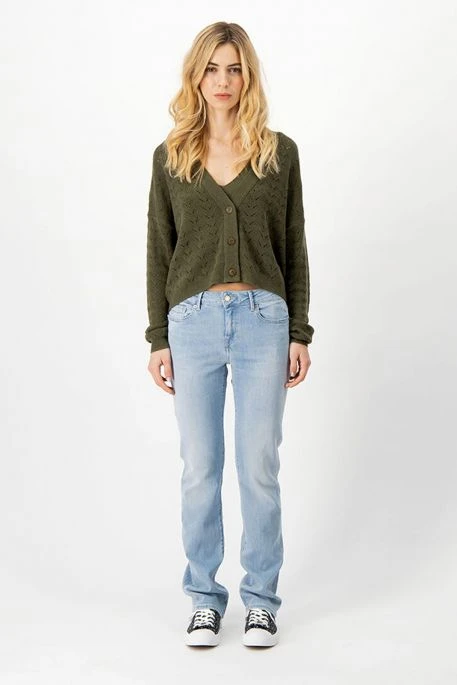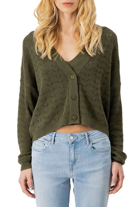 Gilet Teddy Smith en maille Bonnie pour femme. Gilet à manches longues, coupe décontractée et courte, encolure en V, fermeture par boutons. Ce gilet possède un tricot fantaisie.