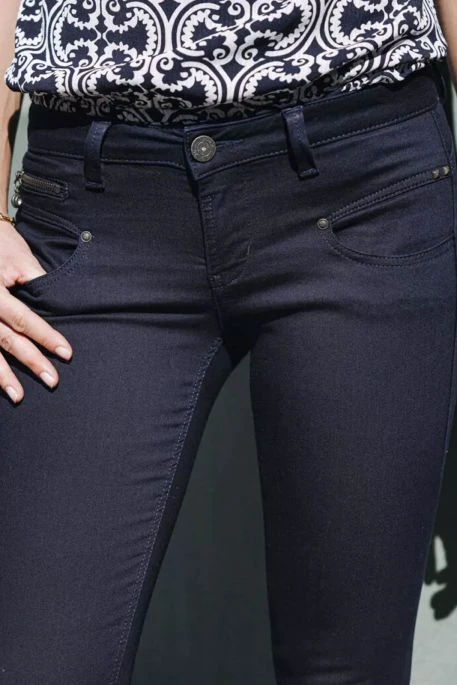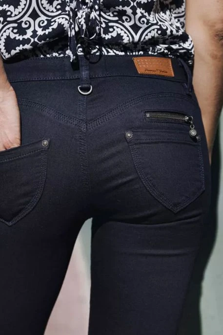 Jean Freeman T.Porter Alexa Cropped pour femme. Jean de coupe skinny, longueur 7/8, taille normale, fermeture par bouton et braguette zippée. Matière super stretch, effet gainant et ultra confort. Zips et détails fantaisies sur les poches.