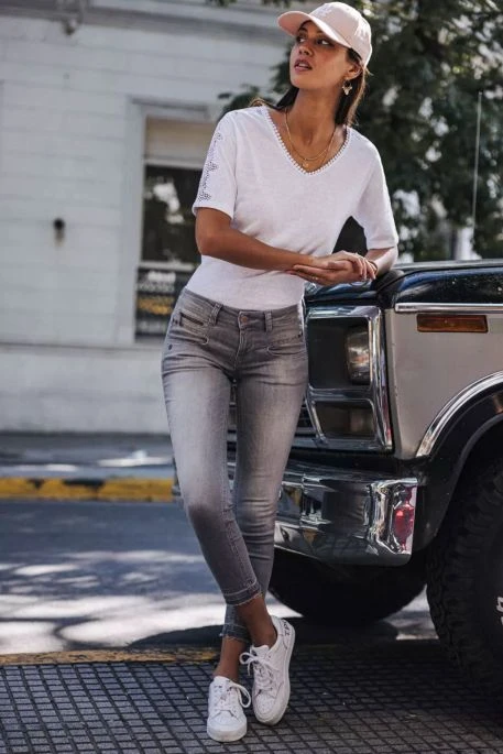 Jean Freeman T.Porter Alexa Cropped pour femme. Jean de coupe skinny, longueur 7/8, taille normale, fermeture par bouton et braguette zippée. Matière super stretch, effet gainant et ultra confort. Zips et détails fantaisies sur les poches.