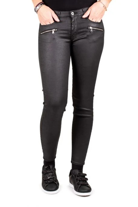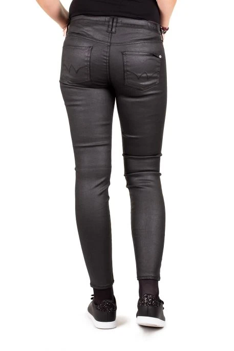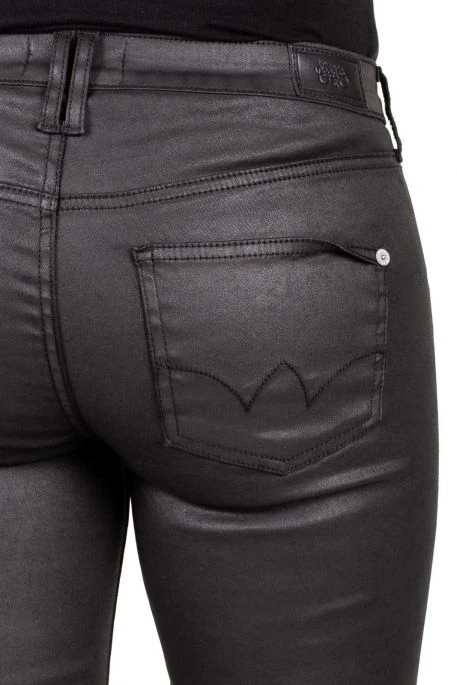 Jean TDC pour femme, jean noir en tissus enduit ultra stretch, coupe skinny, taille intermédiaire, coupe 7/8,