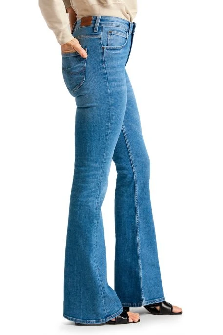 Jean Lee Breese pour femme. Jean taille haute, coupe ajustée du bassin, des cuisses jusqu’aux genoux, bas de jambe évasé. Fermeture par bouton et braguette zippée. Modèle 5 poches.