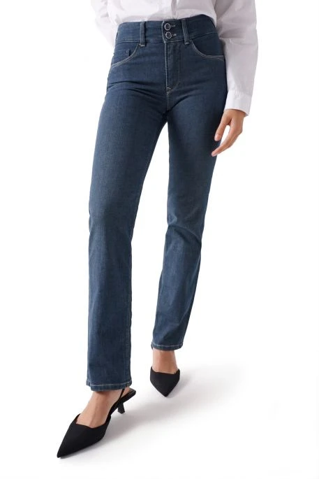Jean Salsa Secret Push In pour femme. Jean de coupe droite, taille haute, fermeture par 2 boutons et braguette zippée. Jean 5 poches, Push-In qui produit un effet ventre plat et un maximum d’élégance. Coloris bleu verdâtre.