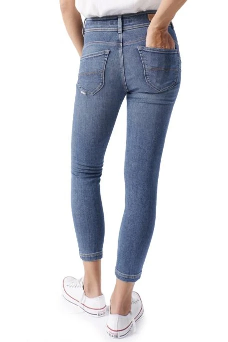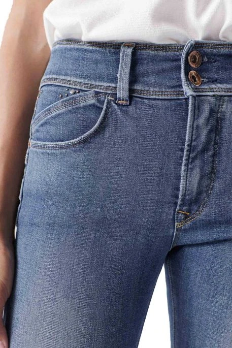 jean Salsa pour femme, taille haute,jambe skinny raccourcie, Fermeture par deux boutons et fermeture éclair. Cinq poches. Passants. Application métallique au niveau de l’ ourlet et sur la poche.