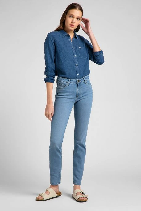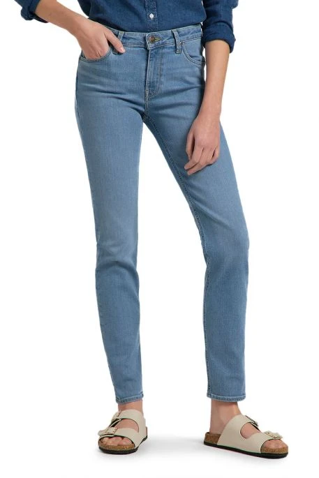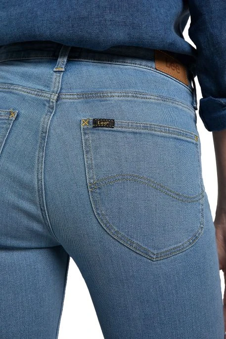 Jean Lee Elly pour femme. Jean de coupe slim sans être skinny, hauteur de taille intermédiaire, fermeture bouton et braguette zippée. Patch Lee® en cuir à l’arrière.