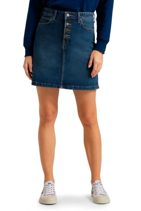 Jupe en jean Lee, taille haute, forme trapèze, longueur genou, braguette boutonnée