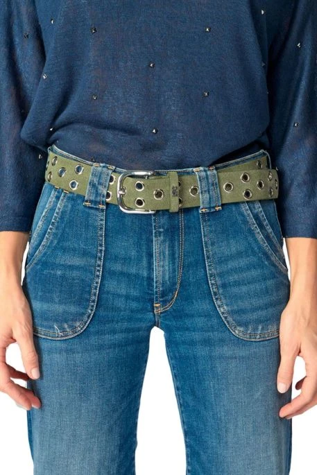 Ceinture Temps des Cerises pour femme, ceinture TDC en daim kaki, ceinture avec ses œillets métalliques argentés, sa boucle argentée, Largeur de la ceinture : 3,7cm.
