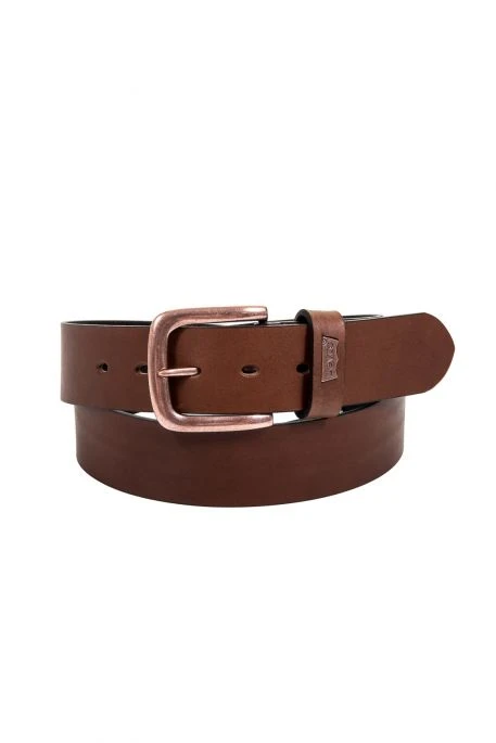 /Ceinture Levis Cabazon pour homme. Ceinture confectionnée en cuir véritable avec boucle en acier cuivré et logo Levi’s Batwing en acier incrusté dans le passant en cuir. Largeur du cuir : 40 mm