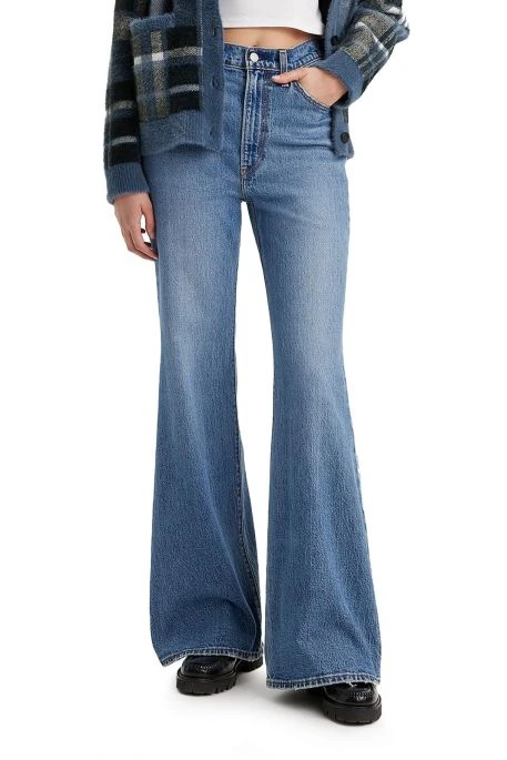 Jean Levi’s® Ribcage Flare pour femme. Jean de coupe slim au niveau des hanches et des cuisses, taille super haure, jambes évasées. Fermeture par bouton et braguette zippée. Modèle 5 poches.