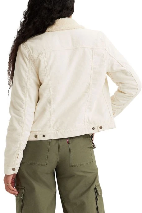 Veste en velours fines côtes Sherpa Levi’s® Trucker pour femme. Veste Sherpa de coupe décontractée, manches longues avec poignets à boutons pressions, fermeture par patte de boutonnage à boutons pressions. Ce modèle de sherpa femme possède 2 poches poitrines en pointe à boutons pressions et 2 poches latérales passepoilées.