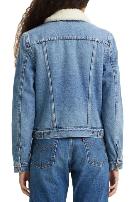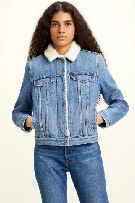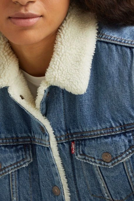 Vestes Sherpa Levi’s® Trucker pour femme. Veste Sherpa de coupe décontractée, manches longues avec poignets à boutons pression, fermeture par patte de boutonnage à boutons pression. Ce modèle de sherpa femme possède 2 poches poitrine en pointe à boutons pression et 2 poches latérales passepoilées