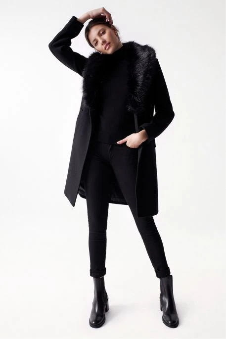 Manteau Salsa Fur à manches longues. Manteau noir en drap de laine avec col en fourrure synthétique amovible, encolure cache-coeur, fermeture bouton sur le devant. Ce manteau possède deux poches latérales passepoilées. Doublure intérieure. La coupe est ajustée.
