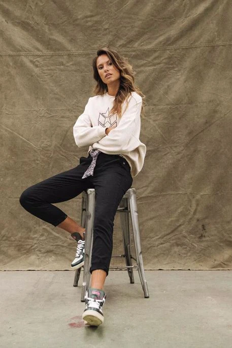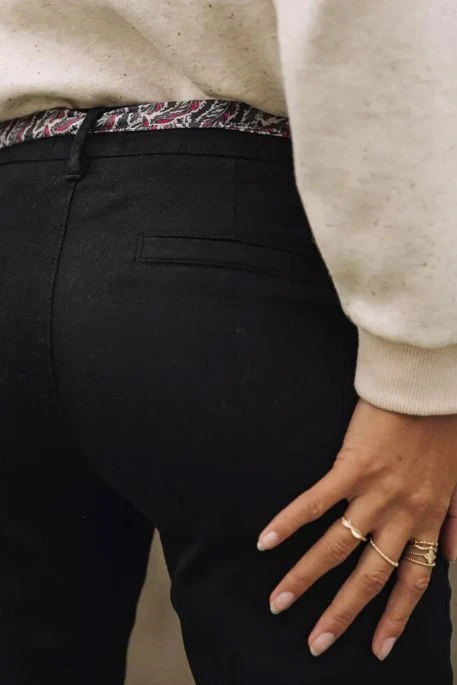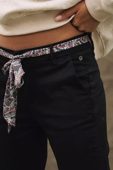 Pantalon Freeman Porter Claudia Felicita pour femme. Pantalon chino de coupe slim, poches italiennes à l’avant et passepoilées à l’arrière. Vous allez adorer sa toile strech et sa longueur 7/8ème. Un joli foulard glissé dans la ceinture marquera votre taille.
