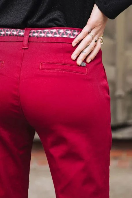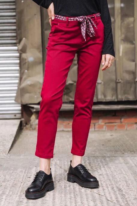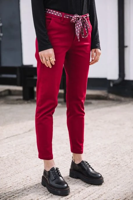 Pantalon Freeman Porter Claudia Felicita pour femme. Pantalon chino de coupe slim, poches italiennes à l’avant et passepoilées à l’arrière. Vous allez adorer sa toile strech et sa longueur 7/8ème. Un magnifique foulard glissé dans la ceinture marquera votre taille.