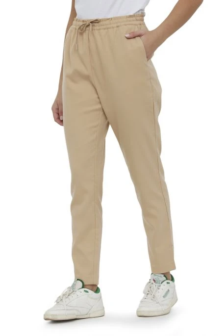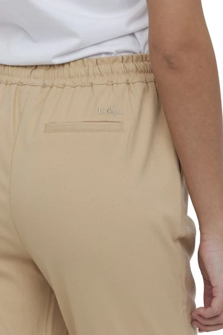 Pantalon Lee Cooper Guri pour femme, pantalon fluide de couleur sable avec une coupe droite, broderie Lee Cooper à l’arrière du pantalon.