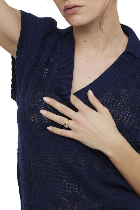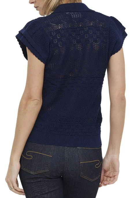 Polo Lee Cooper Bimia navy, pull en maille ajourée avec encolure en V, pull avec manches courtes, les manches sont à volants,