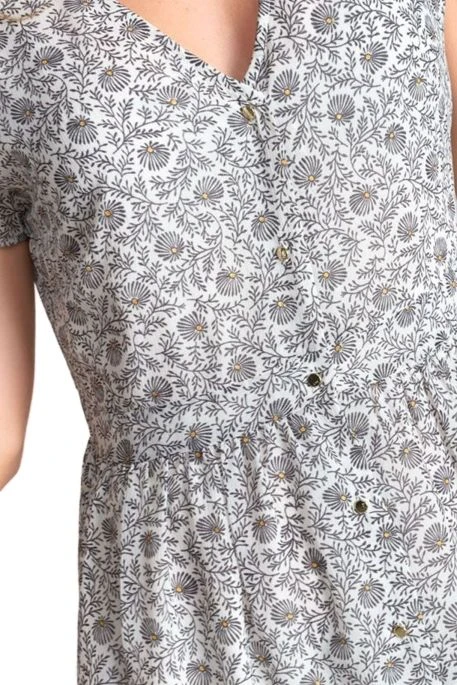 Robe Le Temps des Cerises Chardon, robe courte TDC avec un joli motif fantaisie, encolure en V, taille élastiquée à l’arrière, fermeture sur toute la longueur par des petits boutons, la robe est doublée et le bas est volanté.