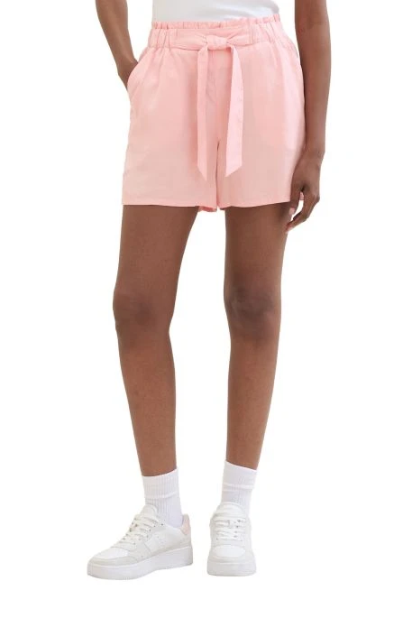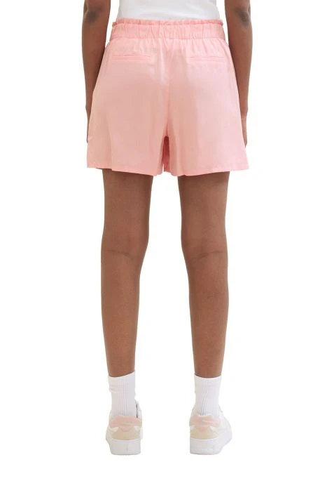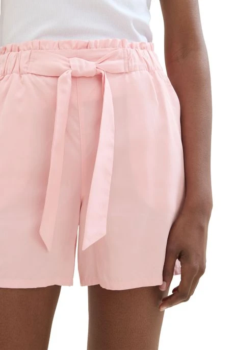Short pour femme Tom Tailor. Short fluide ceinturé et élastiqué à la taille par un lien en tissus. 2 poches italiennes, 100% Lyocell. Coupe relaxed fit.