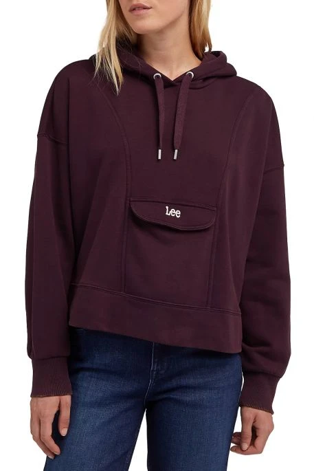 Sweat Lee Hoodie pour femme, sweat à capuche avec lien de serrage, la coupe est courte, une poche à rabbat avec le logo brodé s’affiche sur le devant,
