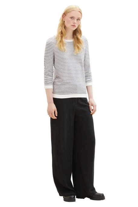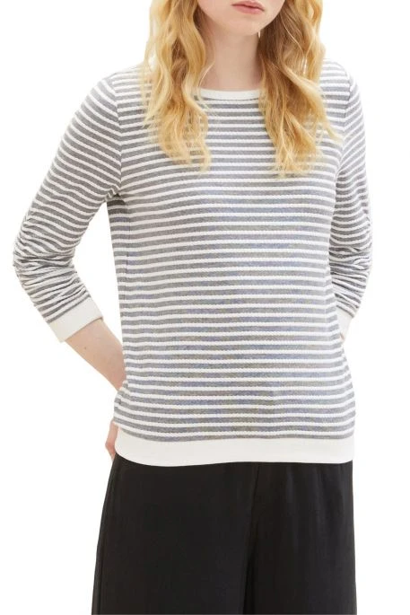 Pull Tom Tailor pour femme, pull manches longues avec encolure ronde, manches 3/4, pull rayé avec coupe droite et poignets côtelés contrastés.