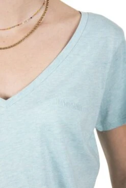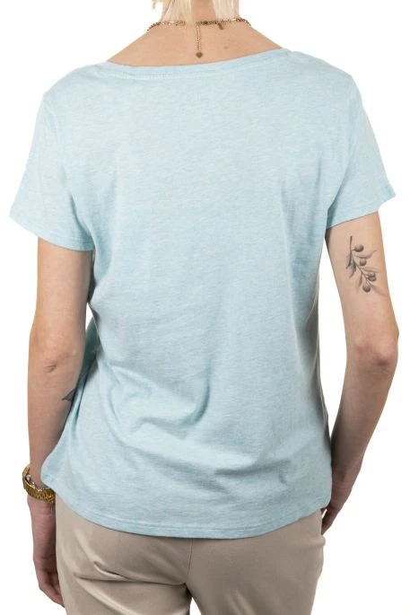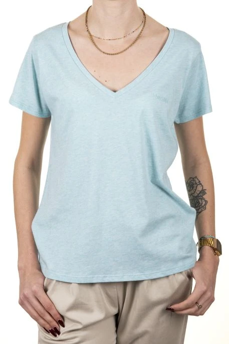 T-shirt Narcisse Teddy Smith pour femme. Tee shirt col V manches courtes, de couleurs bleu ciel chinée. Ce vêtement possède le label OEKO-TEX : il garantit un processus de fabrication certifié et contrôlé, respectueux de votre peau