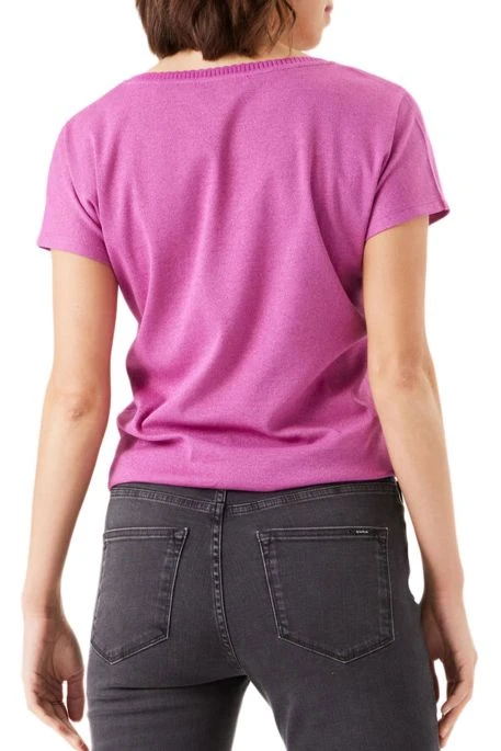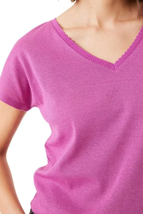 Tee-shirt Garcia Lurex pour femme. Tee-shirt à manches courtes avec lurex, coupe droite, col en V. Bord en maille au niveau du col.