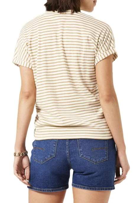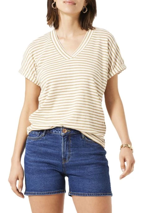 Tee Shirt Garcia pour femme, tee shirt manches courtes avec encolure en V, tee shirt rayé avec files métalliques.