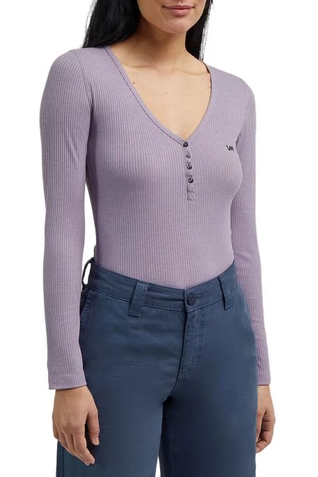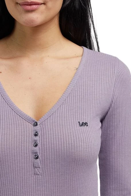 Tee-shirt Lee Henley pour femme. T-shirt à manches longues, coupe slim avec col en V et patte de boutonnage à 4 boutons. Tissu côtelé souple et léger, logo Lee brodé sur la poitrine.
