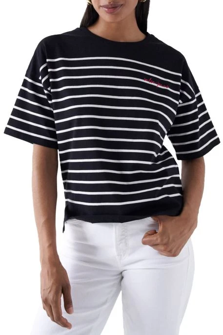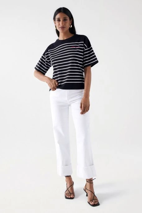 Tee shirt Salsa pour femme. T-shirt manches courtes rayés façon marinière. Coupe large avec épaules raglan et col rond. Petit logo poitrine « salsa jeans » brodé.