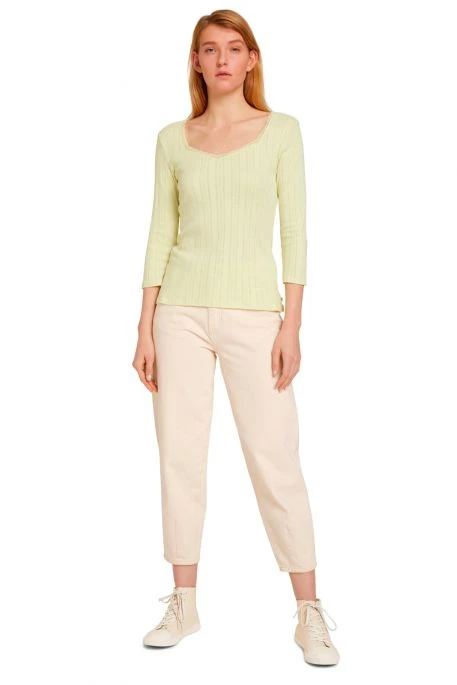 / Tee shirt de couleur jaune clair Tom tailor pour femme. Tee shirt manches 3/4. Col V avec petite dentelle.