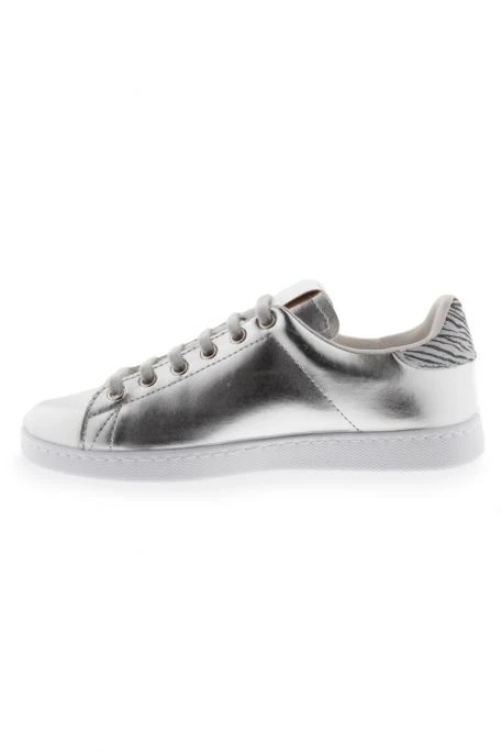 Baskets Victoria zébre pour femme. Baskets argentées avec le logo de Victoria en imprimé zébre. Lacets gris clair.