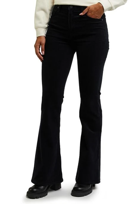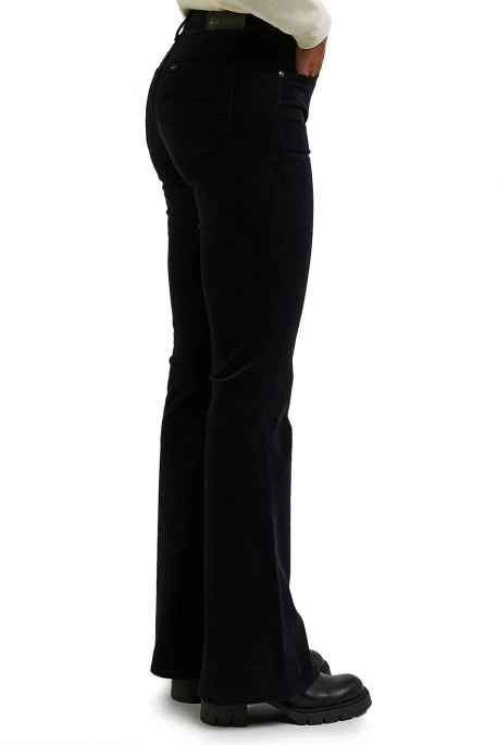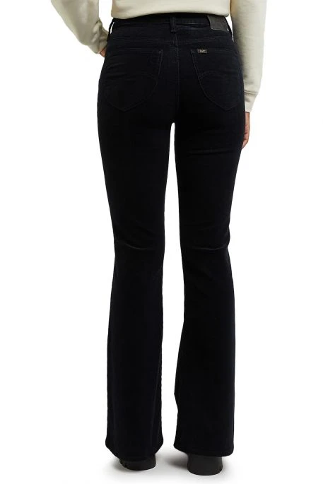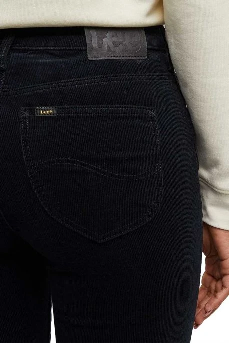 Pantalon en velours Lee Breese pour femme. Jean taille haute, coupe ajustée du bassin, des cuisses jusqu’aux genoux, bas de jambe évasé. Fermeture par bouton et braguette zippée. Modèle 5 poches.